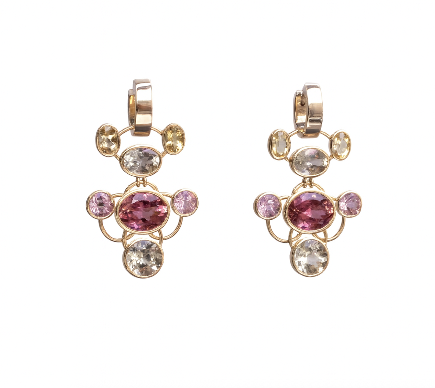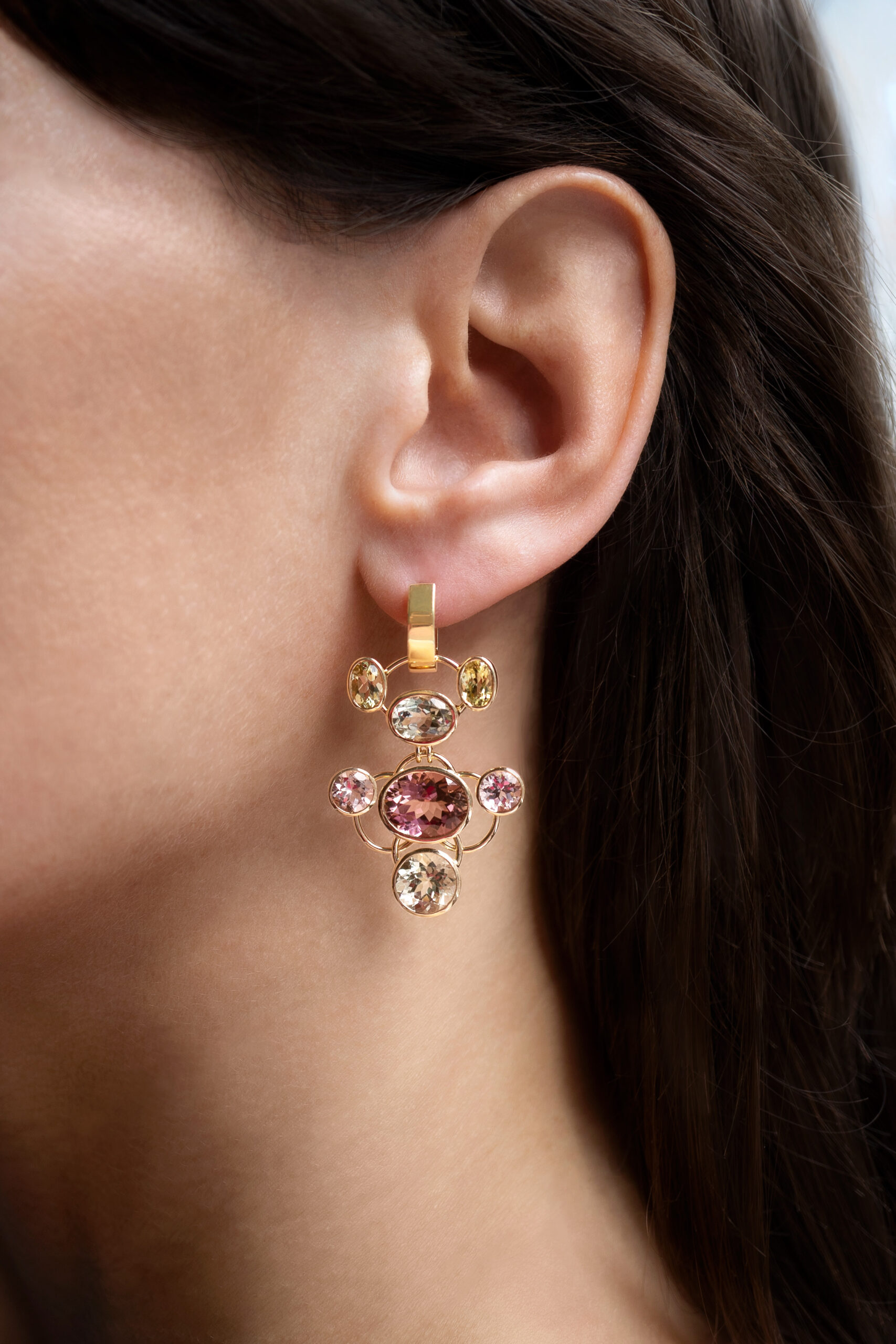 Four vibrant tourmalines (9.12 carats), four soft-hued morganites (2.49 carats), and six luminous beryls (5.24 carats) come together in a cascading composition, delicate yet bold, joyful yet refined. Crafted in 18k yellow gold, their articulated design sways gently with every step, catching the light like falling petals at sunset.