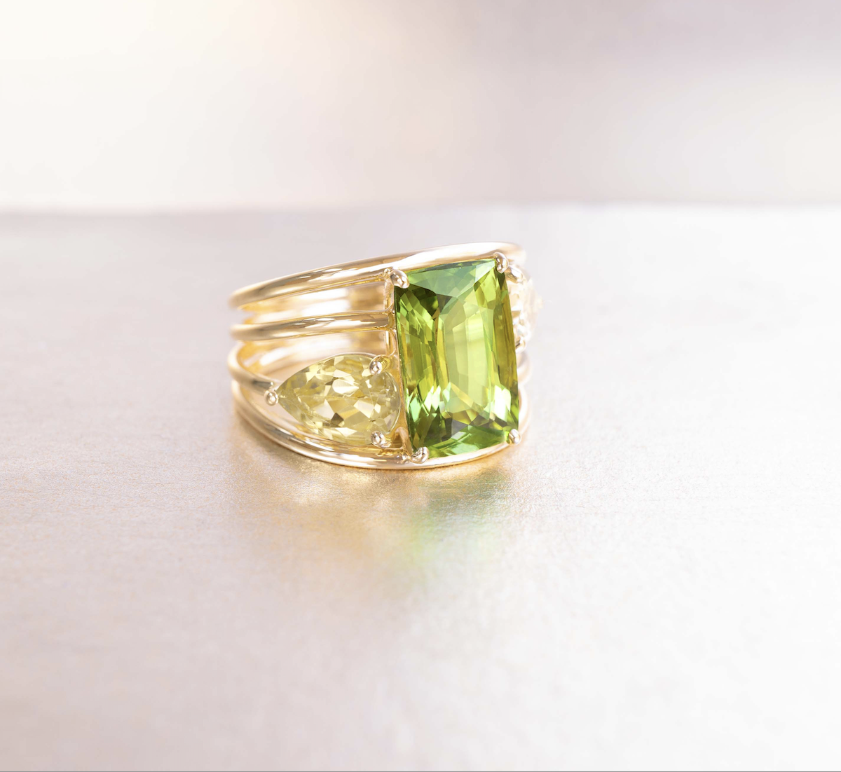 Fresh and full of light, the Cordes Ring by Coralie Van Caloen brings a joyful energy to the hand. Set with vibrant green peridot beryls totaling 8 carats, the stones glow with natural brilliance and clarity. Twisted bands of 18k yellow gold embrace the gems in the signature cordes design, bold, tactile, and unmistakably sculptural. A luminous creation that captures the spirit of summer all year long.