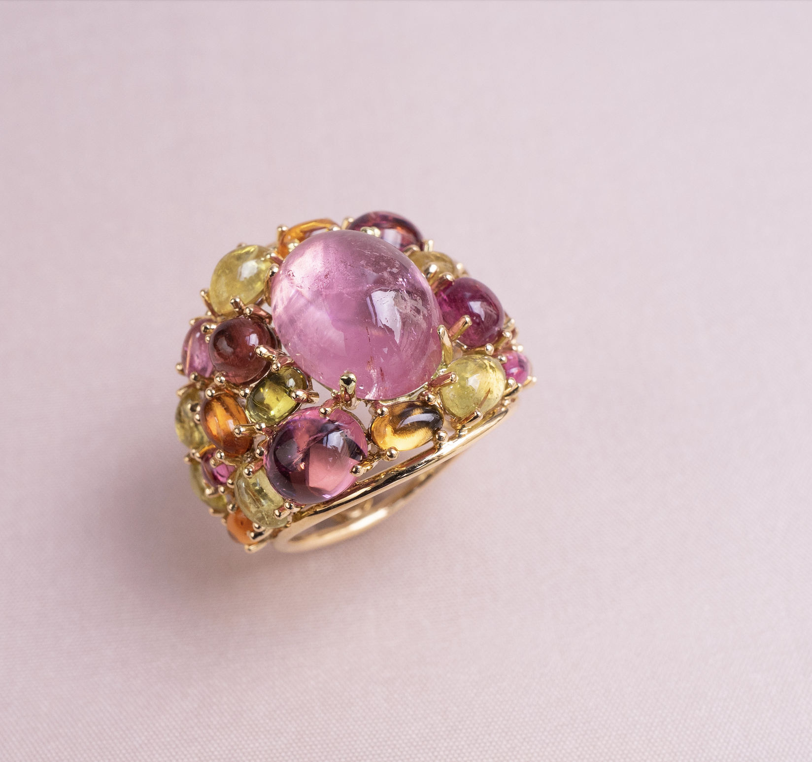 A joyful celebration of colour and craftsmanship, this cocktail ring by Coralie Van Caloen catches the light ย and the eye, with irresistible charm. At its heart, two luminous cabochon tourmalines in pink and yellow dance in perfect harmony, brought to life by a sculptural setting of 18k white and yellow gold. Bold yet effortlessly elegant, it’s a piece designed to spark conversation and admiration, wherever you wear it.
