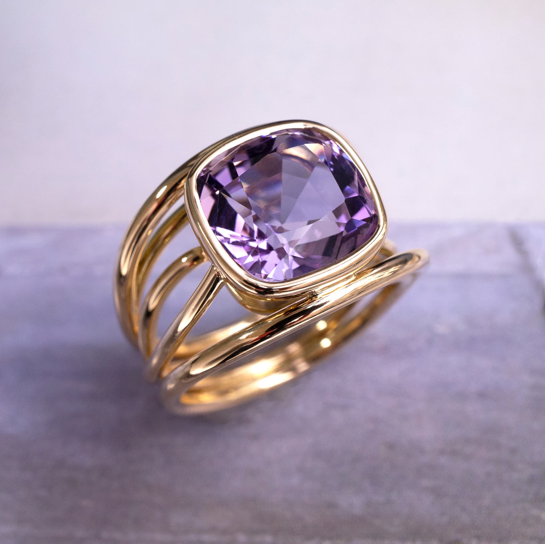 Inspired by the graceful tension of twisted cords, the Cordes Ring by Coralie Van Caloen is a bold reinterpretation of classic design. At its centre, a rich violet amethyst radiates depth and luminosity, its faceted cut catching the light with every movement. The sculptural gold setting wraps around the stone like flowing strands, powerful, tactile, and unmistakably feminine. A striking piece with an architectural soul.