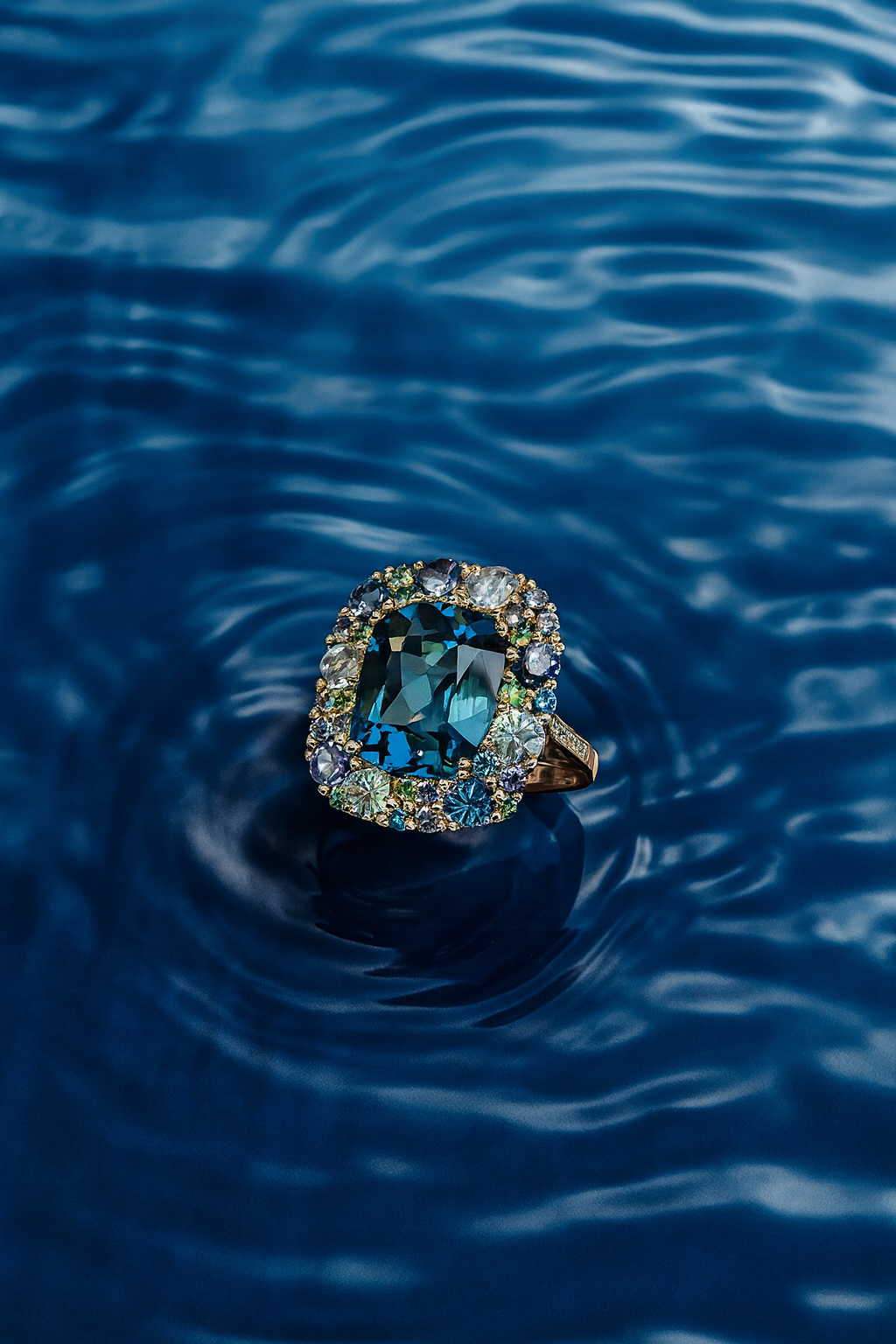 Fall under the spell of this breathtaking 18k rose gold ring, showcasing a stunning 6.56-carat cushion-cut London blue topaz. The central gem is gracefully encircled by a radiant halo of blue topaz, iolite, tsavorite, and diamonds, creating a symphony of color and brilliance.