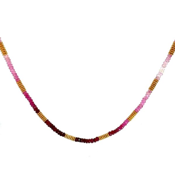 Leaf and Petal necklace garnet, rubies and pink sapphire. Gorgeous mixed garnet, ruby and pink sapphire briolettes and little etched golden beads dangling from a gold-filled chain with gold-plated oval leaves. Length: 43cm-48cm adjustable . Handcrafted.