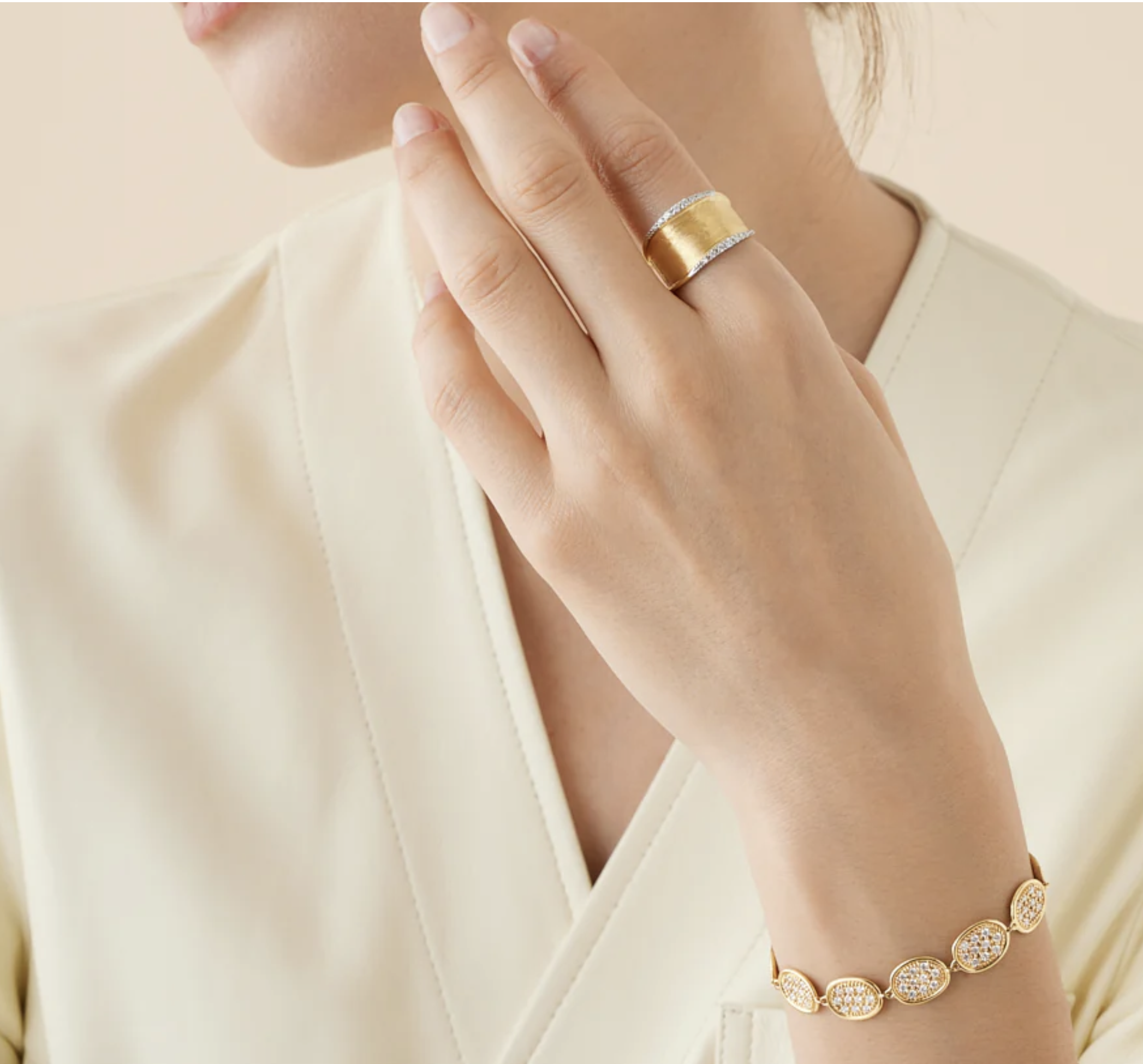 Featuring an irregular surface and linear design, this 18kt yellow gold diamond band ring has been finely hand-engraved using an ancient Florentine technique and is embellished by elegant side profiles featuring a brilliant-cut diamond pavรฉ.