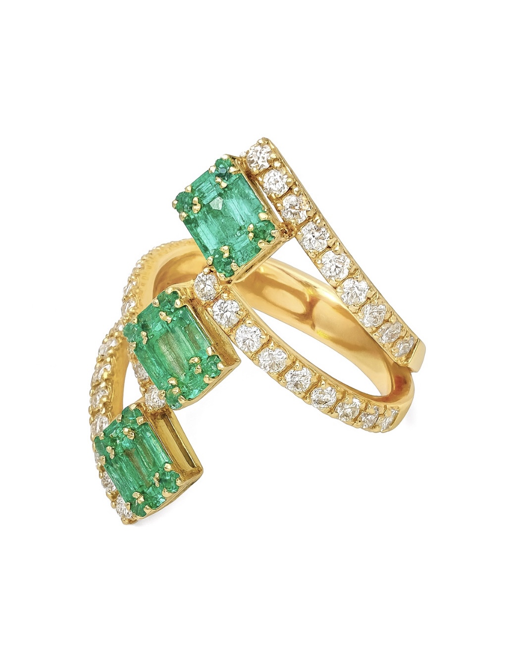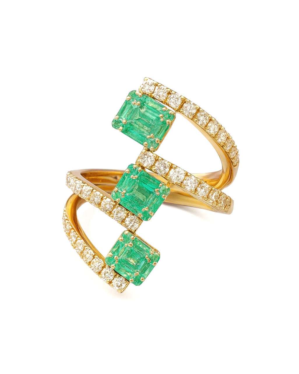 From Myriam F Since 1990, this Triple Emerald Ring embodies the timeless union of color and light. Three vivid emeralds (0.63 ct) form the heart of the design, their deep green glow symbolizing renewal and vitality. Surrounding them, brilliant diamonds (0.66 ct) illuminate each facet, enhancing the ringโs natural elegance and allure.